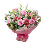 Ihr Blumengruß besteht aus pinken Lilien, rosa Rosen und Schnittgrün.