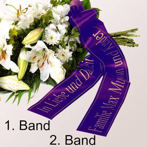 Die Trauerschleife besteht aus 2 lila Schleifenbändern (je 80 cm). Jedes Schleifenband kannst Du mit Deinem persönlichen Text beschriften lassen (je Band bis 50 Zeichen). Hinweis: Gib Deinen Text bitte nur in lateinischen Buchstaben (keine Sonderzeichen) ein.