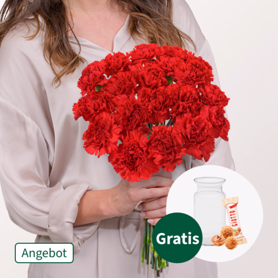 Ein Blumenklassiker zum Frauentag am 8. März oder zu jedem anderen Tag. 19 topfrische Nelken im Bund im kräftigen Rot mit einer dekorativen Schleife. Frisch für Dich zusammengestellt, mit Pflegetipps, Blumennahrung und Wasser versorgt.