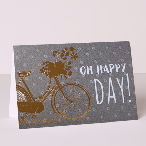 Du erhältst: eine dekorative Grußkarte (Faltkarte), die ein Fahrrad in goldfarbener Prägung zeigt und der Aufschrift „Oh Happy Day!“.