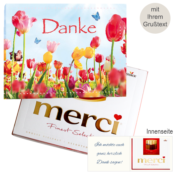 Einen bleibenden Eindruck und lang anhaltende Freude bereitest Du mit dieser Merci Karte. Sende persönliche süße Grüße an Deine Lieben mit wunderschönen Karten zum selbst beschreiben. In jeder Karte, die aus haptisch festem Papier für einen hochwertigen Eindruck besteht, ist eine köstlichen Packung Merci Finest Selection Große Vielfalt (250 g). Die Merci bietet für jeden Geschmack die richtige Sorte: Edel-Rahm, Kaffee-Sahne, mandeln-Milch-Nuss, Edel-Nougat, Edel-Marzipan, Herbe Sahne, Dunkle Mousse und Milch-Praliné. Entdecke die maximale Auswahl an gefüllten und nicht gefüllten merci-Schokoladen Spezialitäten.