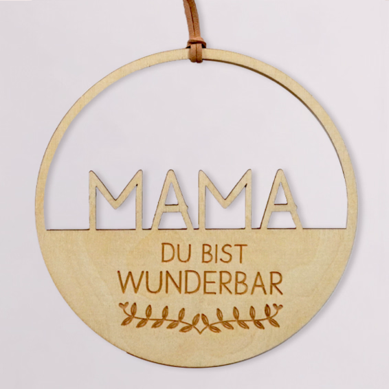 Verschenke einen Holz-Dekoanhänger mit einem Lederband zum Aufhängen. Dieser trägt die schöne Botschaft „Mama du bist wunderbar“.