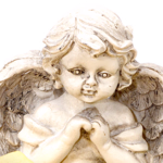 Schöner Trauergruß in Herzform (ca. 25 cm) aus weißem Wurzelholz dekoriert mit cremefarbenen Rosen, grünen Hypericum, weißen Santiniballs, Pistochia, Eukalyptus und betendem Engel aus Polyresin.