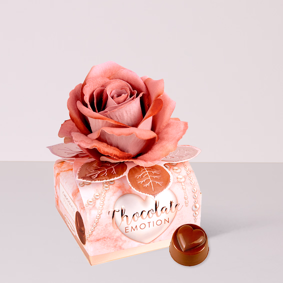 Leckere Nougatpralinen in einer hübschen Verpackung. Verziert mit einer außergewöhnlichen Rose bestehend aus einem einzigartigen Stoff, der sich in einem ansprechenden Rosé Goldton präsentiert. Ein leckeres und schön anzusehendes Geschenk.
