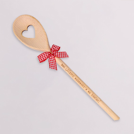 Der Kochlöffel mit Schleife ist als kleines Kompliment gedacht und hat ein Länge ca. 30 cm, aus Buchenholz und mit einem ausgefrästen Herzmotiv gefertigt.