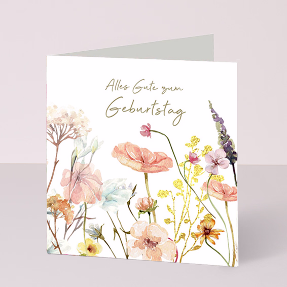Eine dekorative quadratische Grußkarte (Faltkarte) mit der Aufschrift „Alles Gute zum Geburstag“ und einem persönlichem Grußtext.