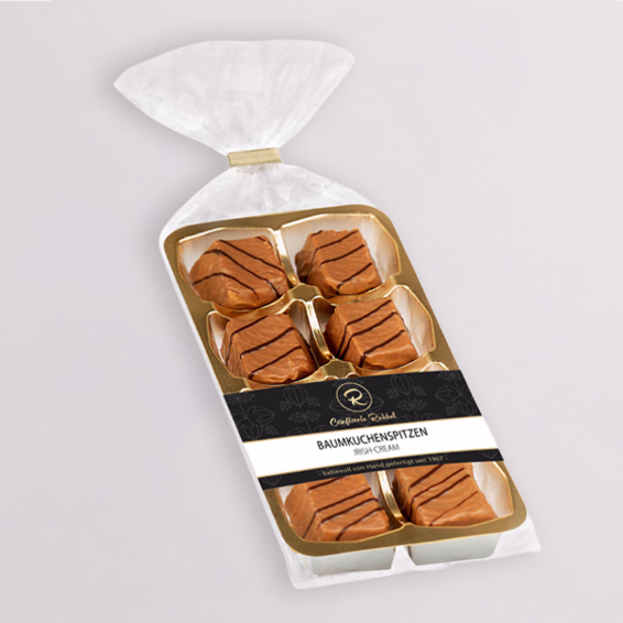 Baumkuchenspitzen (100 g) mit Zartbitterschokoladenüberzug und Irish Cream.