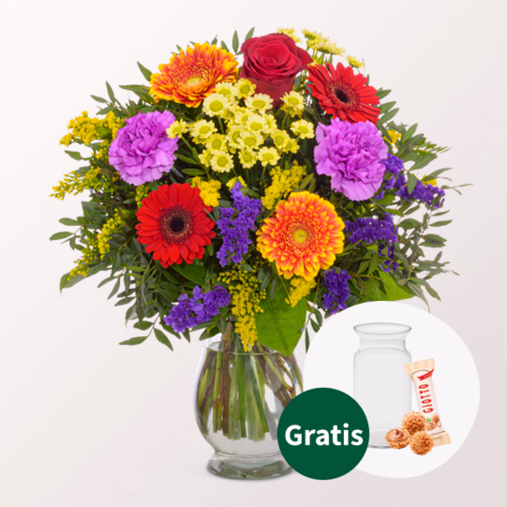 Bunter Blumenstrauß mit roter Rose Monte Carlo, hellgelben Santini, Solidago, roten Germini, blauer Statice, fliederfarbenen Nelken, gelb-orangen Germini, Pistochia und Salal. Durchmesser ca. 35 cm. Frisch für Dich zusammengestellt, mit Pflegetipps, Blumennahrung und Wasser versorgt.