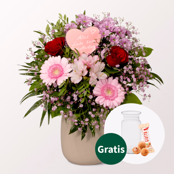 Großartiger Muttertags-Strauß mit roten Rosen, rosa Germini, rosa Schleierkraut, rosa Alstroemeria, rosa Santini, Stecker „Alles Liebe zum Muttertag“, Chico Jumbo, Pistochia und Salal. Durchmesser ca. 30 cm. Frisch für Dich zusammengestellt, mit Pflegetipps, Blumennahrung und Wasser versorgt.