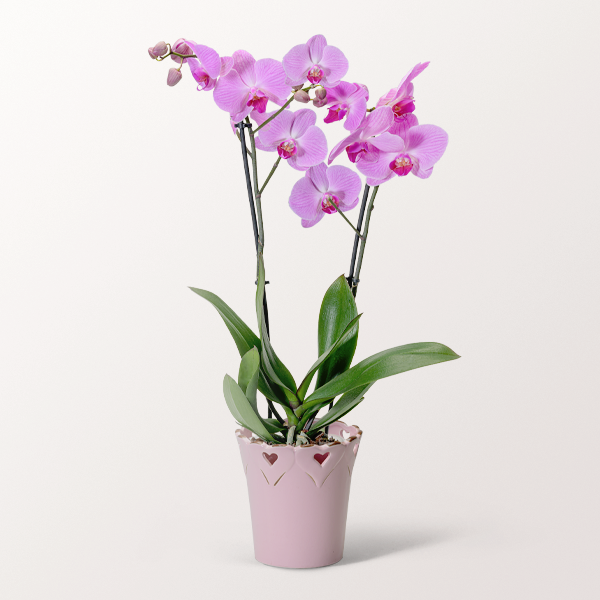 Wunderschöne Orchidee in Rosa in einem wunderschönen Keramiktopf mit Herzmuster. mehr