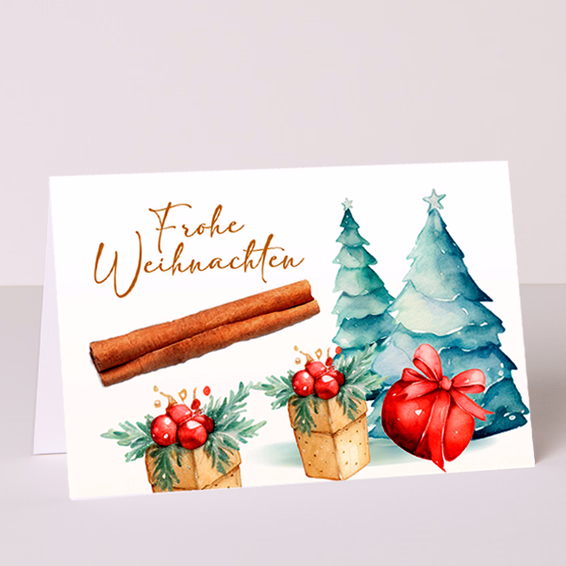 Du erhältst: eine dekorative Grußkarte (Faltkarte) mit einer Zimtstangen Applikation mit Deinem persönlichen Grußtext. Die Zimtstange hat einen ungefähren Durchmesser von 8 cm.