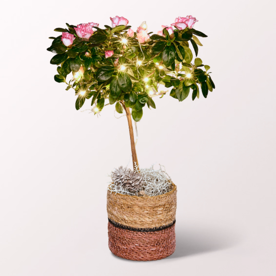 Weihnachtsdeko mal anders. Rosa Azalee als Stämmchen (ca. 40 cm Höhe) mit weißen Zapfen und einer Lichterkette in einem rustikalen Weidenkorb (16 x 16 cm).