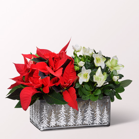 Die zwei beliebtesten Winterpflanzen vereint in einer wunderschönen Zinkschale. Ein roter Weihnachtsstern und eine weiße Christrose werden mit Moos zum Abdecken geliefert. Der Zinkschale hat ca. die Maße 22 x 11 x 9 cm. Die Pflanze ist ca. 20 cm hoch (inkl. Schale).
