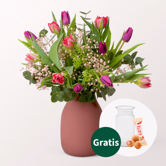 Zauberhafte Mischung aus rosa und lilafarbenen Tulpen, hellrosa Schleierkraut, Thlaspi und Eukalyptus. Durchmesser ca. 25-30 cm. Frisch für Dich zusammengestellt, mit Pflegetipps, Blumennahrung und Wasser versorgt.