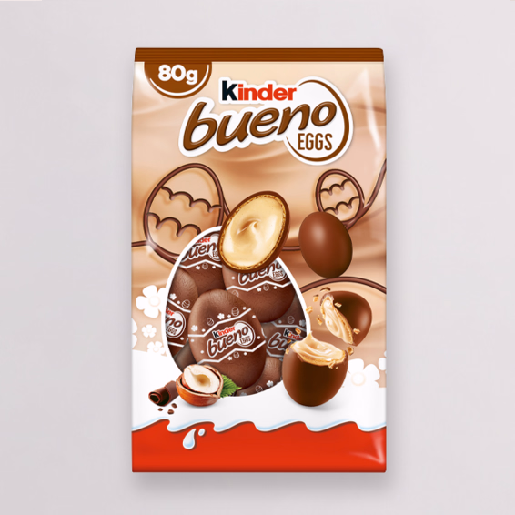 Die kinder Bueno Eggs sind wunderbar knusprig und cremig zugleich – eine zarte Knusperhülle, gefüllt mit einer raffinierten Milch-Haselnuss-Creme und außen umhüllt von feiner Milchschokolade. Dank ihres Mini-Formats sind kinder Bueno Eggs der passende Begleiter für den kleinen Genuss zwischendurch.