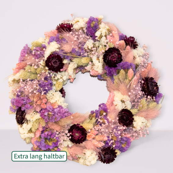 Ein von Hand gefertigter Trockenblumenkranz kombiniert zarte Rosé- und Naturtöne mit kräftigen Akzenten in Dunkelrot und Violett. Verarbeitet wurden unter anderem Strohblumen, violetter Strandflieder, rosa eingefärbte Phalaris-Ähren sowie flauschiger Lagurus in Rosa und Natur. Die Mischung aus feinen Gräsern und detailreichen Blüten verleiht dem Kranz eine edle, moderne Ausstrahlung. Ob als Tür-, Wand- oder Tischdekoration – dieser Kranz bringt eine stilvolle, natürliche Note in jeden Raum. Nur für den Innenbereich geeignet. Trocken lagern und vor direkter Sonneneinstrahlung schützen.