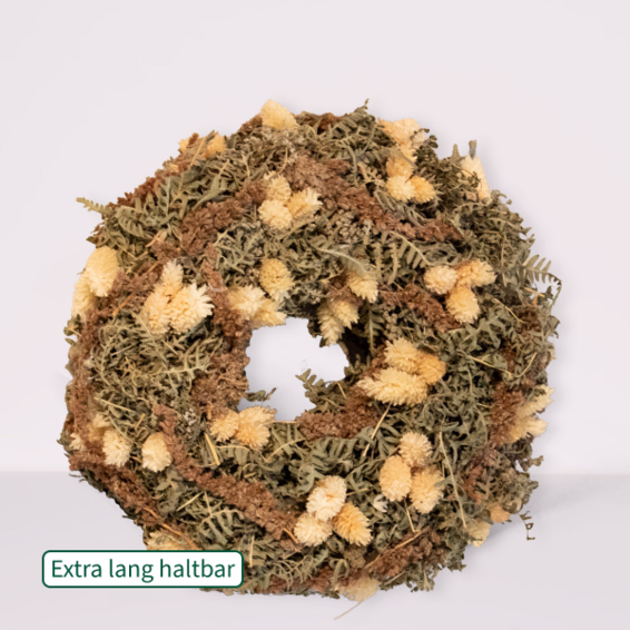 Wunderschöner, handgefertigter Trockenblumenkranz mit einem Durchmesser von ca. 25 cm, der durch seine schlichte Natürlichkeit und harmonische Farbgebung in Beige, Olivgrün und dunklem Rot besticht. Eingearbeitet wurden unter anderem naturbelassener Lagurus, grünlich getrockneter Farn sowie vereinzelt rotbraune Akzente. Die luftig-leichte Struktur verleiht dem Kranz eine natürliche, ruhige Ausstrahlung. Ideal als dezente Wand-, Tür- oder Tischdekoration für alle, die es etwas zurückhaltender mögen. Nur für den Innenbereich geeignet. Trocken lagern und vor direkter Sonneneinstrahlung schützen.
