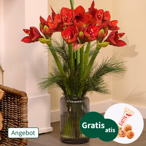 Für eine besonders festliche Überraschung: 10 wunderschöne Amaryllis mit einer Länge von ca. 50 cm, vervollständigt mit Kiefernzweigen. Frisch für Dich zusammengestellt, mit Pflegetipps, Blumennahrung und Wasser versorgt.