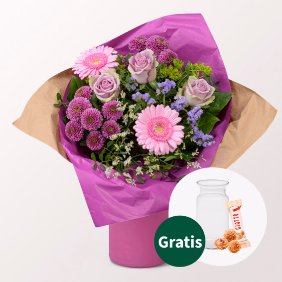 Fliederfarbene Rosen werden mit pinken Santinibällen und rosafarbenen Germini kombiniert. Weißes Limonium, fliederfarbene Statice und Bupleurum sorgen für eine feine, strukturierte Auflockerung. Pistochia, Salal sowie eine pinke Manschette schließen den Strauß harmonisch ab. Durchmesser ca. 30 cm. Frisch für Dich zusammengestellt, mit Pflegetipps, Blumennahrung und Wasser versorgt.