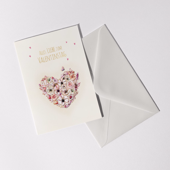 Eine dekorative Valentinstagskarte mit der Aufschrift „Alles Liebe zum Valentinstag“.