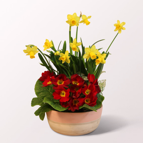 Ein zartes Arrangement in einer lachs-weißen Bambus Bowl (Ø ca. 18 cm, Höhe ca. 8 cm). Es enthält eine wunderschöne rote Primel, Narzissen und eine weiße Punktblume (Hypoestes) – eine perfekte Kombination aus bunten Frühlingsblühern für ein stilvolles Highlight in jedem Raum. Die Pflanzen sind ca. 20 cm hoch.