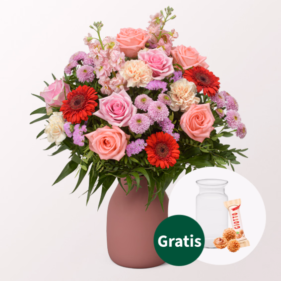 Ein farbenfroher Blumenstrauß mit Rosen, Levkojen und Nelken in warmen Lachstönen. Rote Germini sowie Santinibälle, Rosen und Statice in Rosa setzen lebendige Akzente und verleihen dem Arrangement zusätzliche Tiefe. Das harmonische Zusammenspiel der Blüten mit frischem Grün sorgt für ein herrliches Bouquet mit sommerlicher Leichtigkeit. Durchmesser ca. 50 cm. Frisch für Dich zusammengestellt, mit Pflegetipps, Blumennahrung und Wasser versorgt.