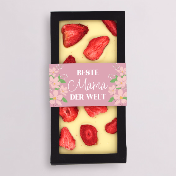 Ein süßer Genuss mit liebevoller Botschaft: Diese cremige weiße Schokoladentafel wird durch fruchtige, gefriergetrocknete Erdbeeren perfekt ergänzt. Mit der Aufschrift „Beste Mama der Welt“ ist sie ein köstliches Geschenk, das von Herzen kommt und garantiert für strahlende Augen sorgt.