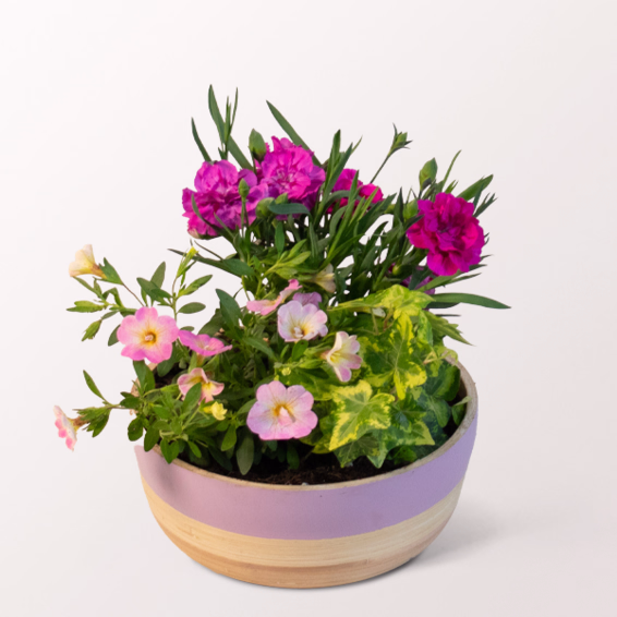 Moderne Bambus-Bowl in Lila-Weiß (ca. 8 cm hoch, Ø 18 cm), bepflanzt mit pinker Nelke, rosa Million Bells und dekorativem Efeu. Ein frischer, vielseitiger Blickfang – ideal zum Muttertag.