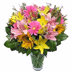 Ihr Blumengruß besteht aus gelben, pinken und weißen Blumen mit Schnittgrün.Hinweis: Abbildung kann vom gelieferten Strauß abweichen.