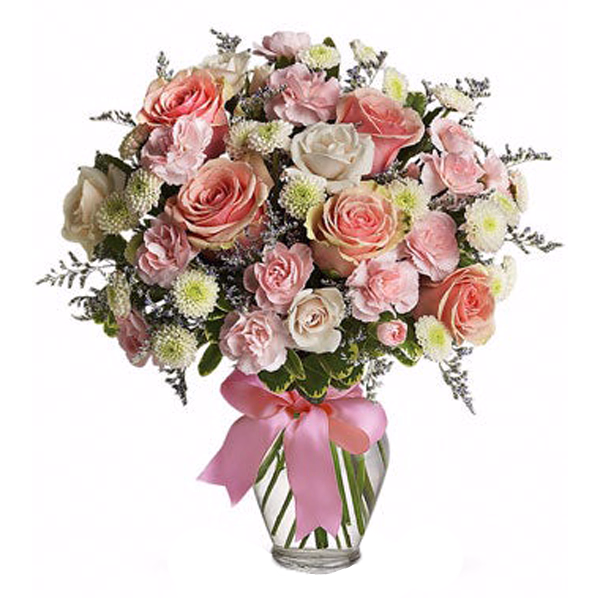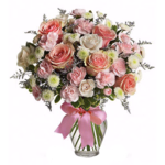 The Cotton Candy bouquet is the perfect arrangement to send to a special elderly person in your life. It includes beautiful light pink and white roses; all beautifully arranged in a glass vase accented with a light pink bow.