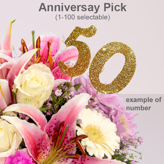 The number plugs are 6 cm in size and will be included in the bouquet by our florist according to your number entered in the input field. All numbers from 1 - 100 are possible. Please enter the number in the field.