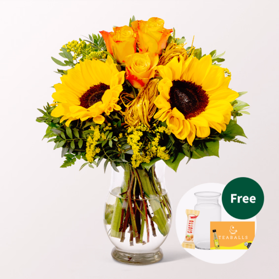 Delightful flower bouquet with orange roses, sunflowers and greens. Diameter about 30 cm. Freshly tied for you with care tips, flower nutrients and supplied with water.