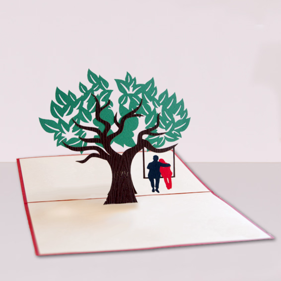 Beautiful folded card with 3D inner part. Depicted is a tree with a swing, with a couple sitting on the swing.