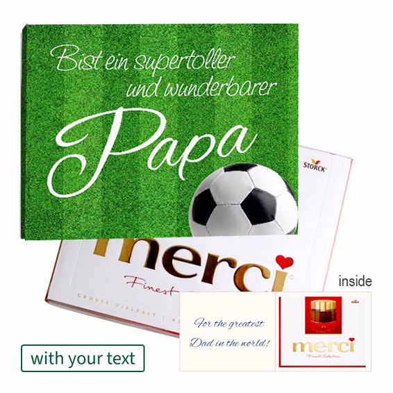 With this Merci card you will make a lasting impression and give lasting pleasure. Send personal sweet greetings to your loved ones with beautiful cards to write your own greetings. In each card, which consists of haptically firm paper for a high-quality impression, is a delicious pack Merci Finest Selection Great variety (250 g). The Merci offers the right variety for every taste: fine cream, coffee cream, almond milk nut, fine nougat, fine marzipan, bitter cream, dark mousse and milk praliné. Discover the maximum selection of filled and unfilled merci chocolate specialities.