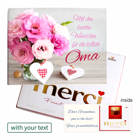 With this Merci card you will make a lasting impression and give lasting pleasure. Send personal sweet greetings to your loved ones with beautiful cards to write your own greetings. In each card, which consists of haptically firm paper for a high-quality impression, is a delicious pack Merci Finest Selection Great variety (250 g). The Merci offers the right variety for every taste: fine cream, coffee cream, almond milk nut, fine nougat, fine marzipan, bitter cream, dark mousse and milk praliné. Discover the maximum selection of filled and unfilled merci chocolate specialities.