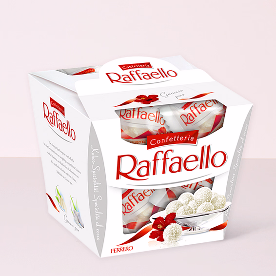 Raffaello is a unique composition of carefully selected ingredients: White almonds from California, coconuts from the Pacific Islands and fine cream. Pampered by the sun and perfect for enjoyment that never ends. Content: 150 g