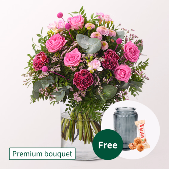 Modern premium bouquet with light pink roses, light pink freesia, pink trommelschlägel, carnations St. Nob. Burgundy, pink limonium, light pink santini ball, eucalypthus and plenty of greens. Diameter about 45 cm. Freshly tied for you with care tips, flower nutrients and supplied with water.