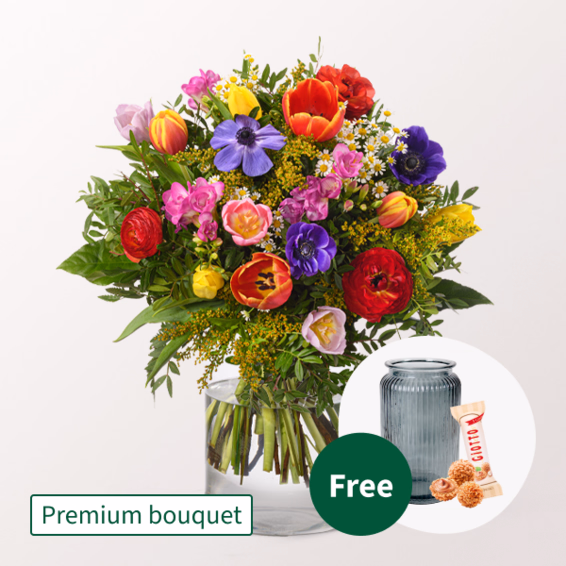 Great premium bouquet with mixed coloured tulips, blue anemones, red ranunculus, pink freesia, solidago, chamomilles and plenty of greens. Diameter about 40 cm. Freshly tied for you with care tips, flower nutrients and supplied with water.