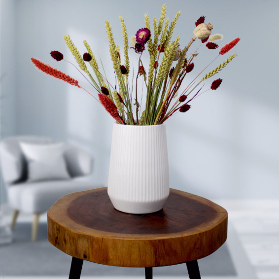 Beautiful dry bouquet in shades of red is a real eye-catcher. It consists of Phalaris, Papaver, Tarwe (Triticum), Setarea, Helichrysum and Lagurus Ovatus and is about 35 cm long. The bouquet is a great gift idea for friends and family.