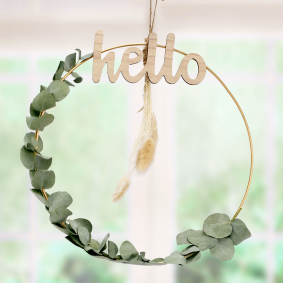 Extraordinary arrangement with a metal ring (35cm) with 3 eucalyptus, 1 agrostis (bouquet grasses), 4 natural colored lagurus and 1 lettering "hello".