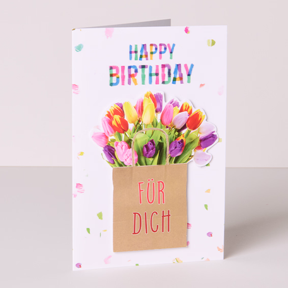 „Happy Birthday“ and „Für Dich“ (for you!) a particularly appealing and high-quality folding card with a cheerful flower appliqué for your birthday.