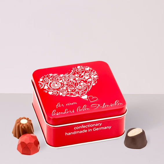Give your loved ones a gift of joy and taste sensations. Surprise them with a theme gift tin „Für einen besonders lieben Menschen“ (For a very special person). Each tin is unique and a real gift for any special occasion. Look forward to a wonderful taste experience that will surely delight your loved one. Included are 20 fine chocolates, each more artfully designed than the other.