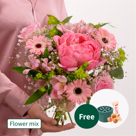 Harmonious flower mix with light pink peonie, bupleurum, light pink alstromerie, light pink roses Avalanche, light pink baby's breath, light pink germini and eucalyptus robusta. Freshly bound for you with care tips, flower nutrients and supplied with water.
