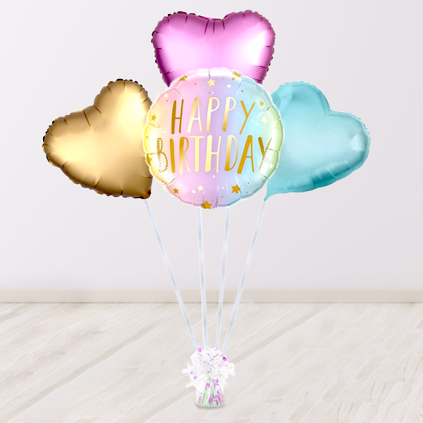 Contents: 1x foil balloon „Happy Birthday“, 1x heart balloon gold satin, 1x heart balloon pink satin, 1x heart balloon lilac (each helium-filled)