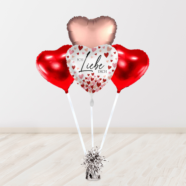 Contents: 1x foil balloon „Ich liebe Dich“, 2x heart balloon red, 1x heart balloon satin red (each helium-filled)