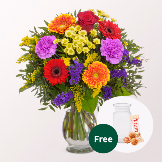 Colourful flower bouquet with red rose Monte Carlo, light yellow santini, solidago, red germini, blue statice, lilac carnations, yellow-orange germini, pistochia and salal. Diameter about 35 cm. Freshly tied for you with care tips, flower nutrients and supplied with water.