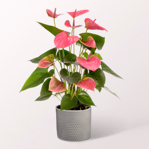 Exotic anthuria in pink in a modern ceramic pot (approx. 14 cm). Plant size approx. 30-40 cm.Important: The plant is slightly poisonous.