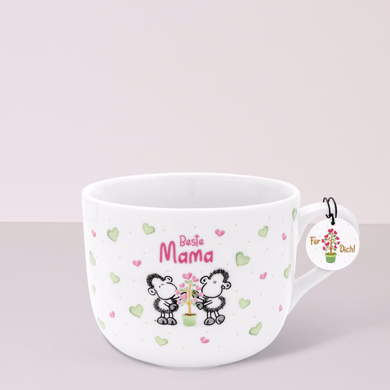 Enrich the break with this unique porcelain mug featuring two adorable sheep, colorful hearts and a delicate plant on a white background. Every moment she can enjoy with this mug will bring joy to her best mom's life. The mug is 9 cm high, holds 620 ml and bears the loving inscription „Beste Mama“ (best Mom).