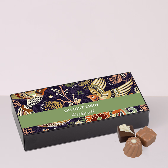 Praline and truffle mix in black packaging with transparent lid and „Du bist mein Zuhause“ (You are my home) design insert.Lovingly put together praline and truffle mix with alcohol.