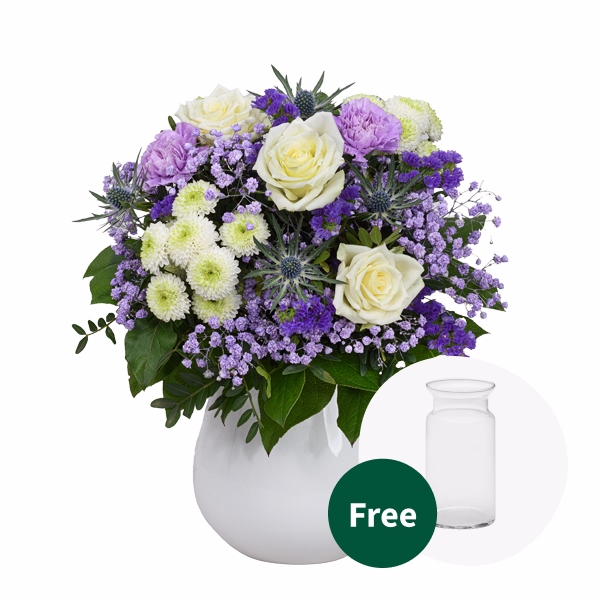 Pretty bouquet with white roses, lilac baby's breath, blue statice, white santini balls, lilac carnations, blue thistle and cut greenery. Diameter about 30 cm. Freshly bound for you with care tips, flower nutrients and supplied with water.